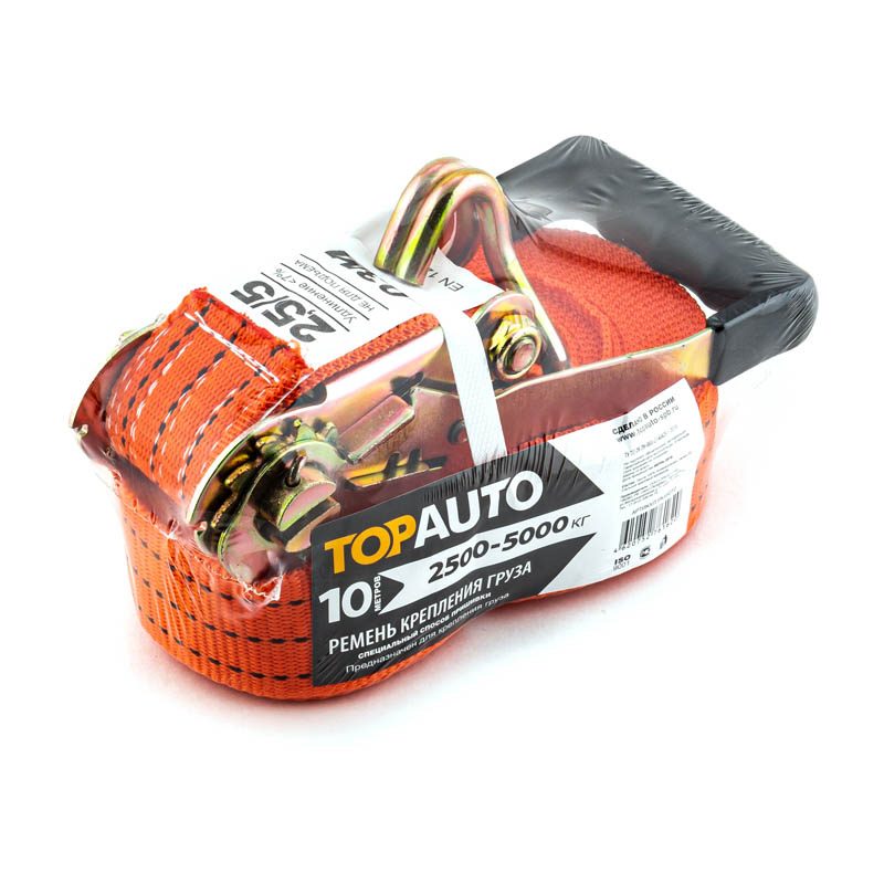 Высококачественные ремни крепления груза ТОП АВТО 2500/5000 кг, ширина ленты 50 мм, сделаны из высокотехнологичной полипропиленовой ленты. Стальные храповым механизмом обеспечивают надёжное крепление груза.