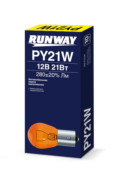 Лампа накаливания PY21W 12В 21Вт (желтая). Лампа указателя поворота. Световой поток(люмен): 280±20%. Кварцевое стекло имеет повышенную механическую прочность и термостойкость, а вольфрамово-молибденовая нить накаливания гарантирует долгий срок эксплуатации. Каждая лампа RUNWAY проходит тщательный контроль. Постоянно тестируется угол освещения, яркость и другие параметры, а также срок эксплуатации ламп.
