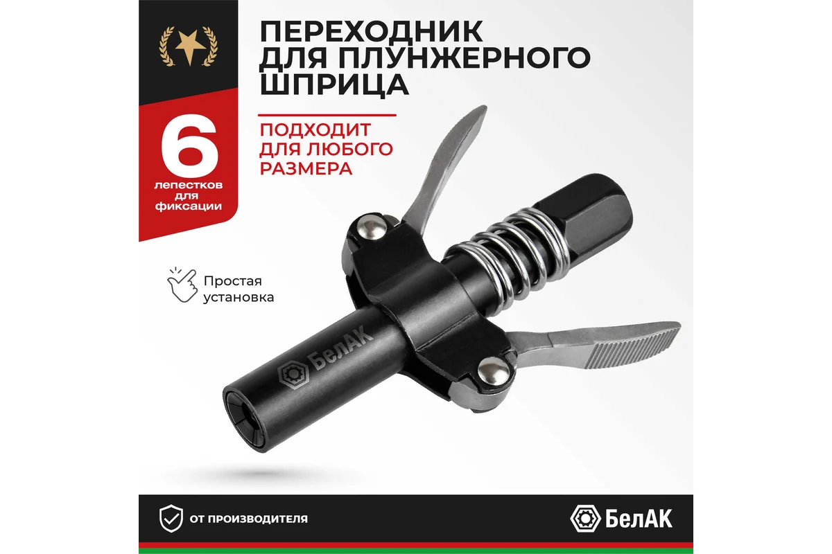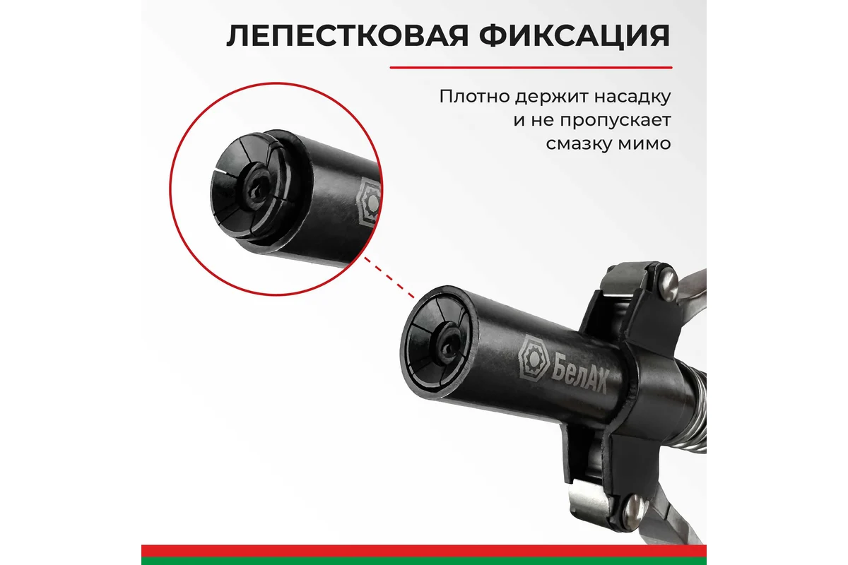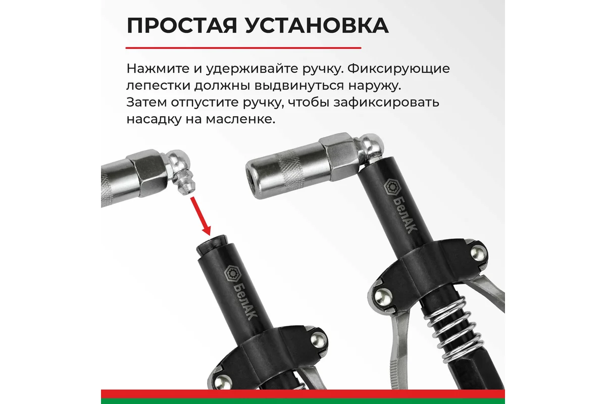 Наконечник на плунжерный шприц для смазки разработан производителем БелАК, награжденным десятью национальными премиями "Автокомпонент года". Это специальное приспособление, соединяющее шприц и пресс-масленку, тем самым упрощая процесс подачи смазки в узлы автомобиля, через встроенные пресс-масленки (тавотницы). Наконечник на шприц для смазки с фиксатором легко и плотно одевается на масленку (тавотницу) путем нажатия на рукоятку. Быстросъёмная насадка поможет смазать крестовины кардана, шкворни, рулевые тяги, шлицевые за считанные минуты, при этом ни грамма смазки не прольется мимо. Насадка на плунжерный шприц БелАК совместима с любыми смазочными пистолетами: ручными, электрическими, пневматическими и подходит для шприцевания любых тавотниц (пресс масленок). Головка для смазки тавотниц имеет широкий спектр применения: строительная техника, сельхозтехника, автомобили, промышленный инструмент.